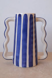 ONDULA Abstract Modern Ceramic Vase – Fir Green & White Striped with Handmade Wavy Handles